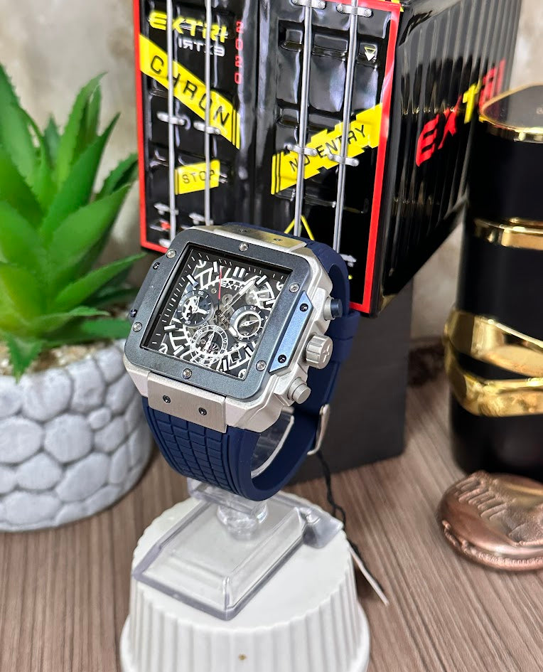 EXTRI PLATEADO FONDO NEGRO MANILLA DE SILICONA AZUL