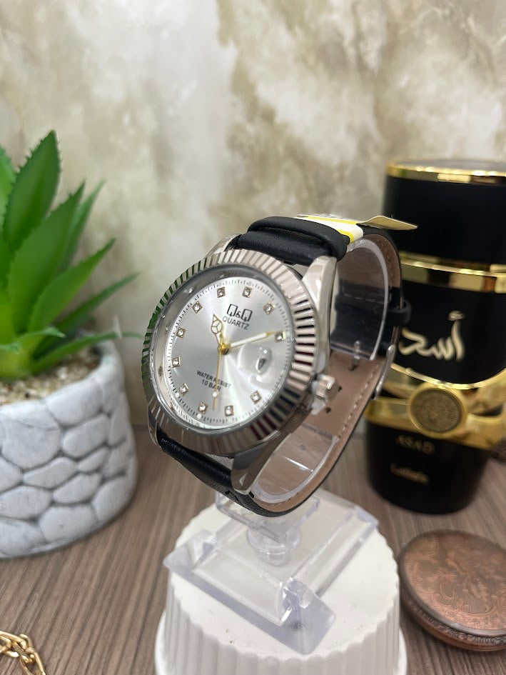 Q&Q PLATEADO MANILLA EN CUERO NEGRA