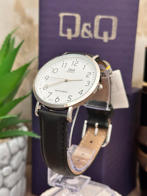 QYQ PLATEADO ESFERA BLANCA MANILLA CUERO NEGRA